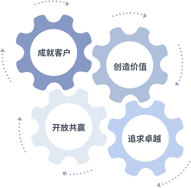 成就客户是一切决策的出发点,,,,创造价值是衡量所有工作的标准,,,,追求卓越是我们做事做人的态度,,开放共赢是我们的格局也是最终的结果。。。价值观的齿轮环环相扣,,推动着组织里的每个人不断向前。。。。